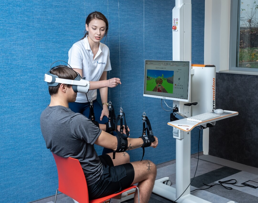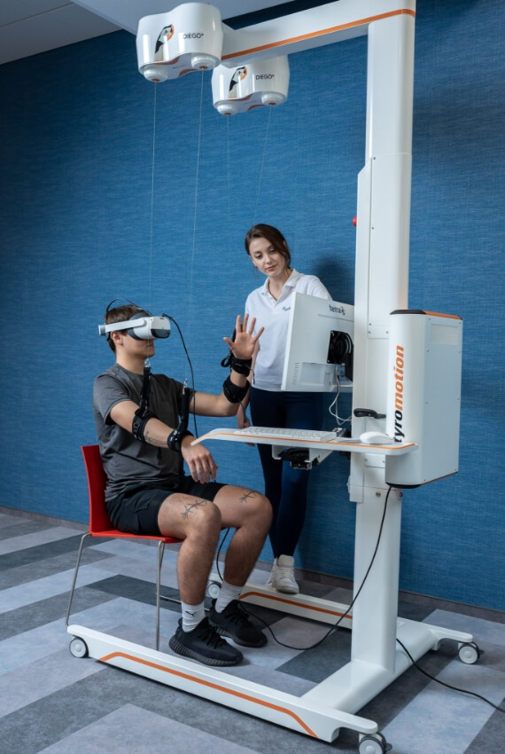 Szczegółową diagnostykę oraz późniejszą rehabilitację kończyn górnych prowadzimy z pomocą DIEGO VR. Robot pomoże w terapii pacjentów z urazami neurologicznymi oraz ortopedycznymi. Umożliwia wytyczenie indywidualnej ścieżki rehabilitacji. Terapia z DIEGO VR zwiększa motywację do wykonywania ćwiczeń dzięki środowisku wirtualnemu, wyposażeniu w gogle 3D i interaktywnym zadaniom, które wykonuje rehabiltowany.